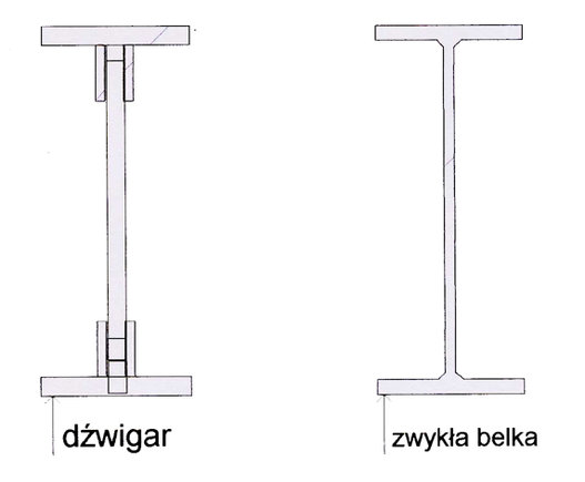 Rysunek drugi, czyli czym różni się dźwigar od belki – dźwigar jest wykonany z różnych kawałków, pospawanych lub skręconych śrubami/znitowanych, natomiast belka tradycyjnie rozumiana jest wykonana w całości „z jednego kawałka”.