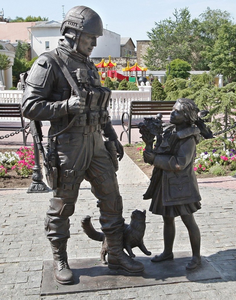 Pomnik na okupowanym Krymie ku czci "zielonych ludzików". I dziecko jest. I nawet kot jest.