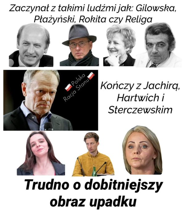 Doskonałe podsumowanie osiągnięć Tuska. Zaczął od przyzwoitego towarzystwa a skończył na zwykłych lujach. Dopisek - przyzwoite towarzystwo to ludzie , którzy służyli Polsce i drugiemu człowiekowi a luje -to "wykształceni z dużych miast" nic sobą nie prezentujący a chętnie sprzedający się i Polskę za guldeny , euro i inne srebrniki. To ludzie godni pogardy. Ale czy oni wiedzą co to mądrość, duma i przyzwoitość? Nie wspomnę o sumieniu czy służbie drugiemu człowiekowi albo własnej Ojczyźnie?