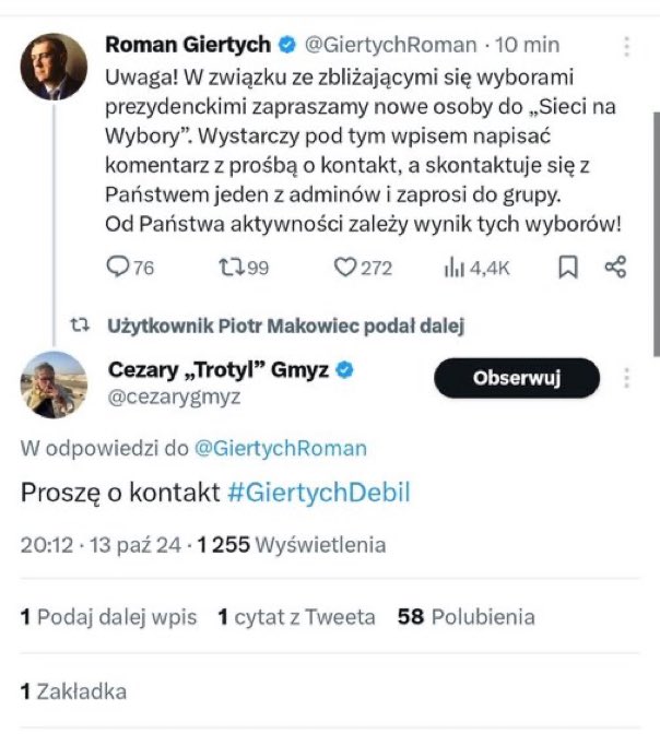 @ProfesorPingwin pisze: "Jestem incognito w trzech grupkach/czatach stworzonych w ramach Sieci Na Wybory przez Giertycha i powiem Wam, że to co tam się odbywa to jest jakieś szaleństwo.Każdy z jego koordynatorów (co najmniej kilku, ale jest ich chyba więcej) ogarnia po kilkadziesiąt (!) oddzielnych grupowych czatów, w których są zgrupowani ludzie (po kilkadziesiąt/set osób na jednym) zaprzęgnięci do promowania jego codziennych hashtagów. Czaty mają nadane numerki, jak w jakimś obozie pracy.