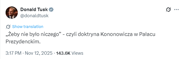 Ten Tuska post z X o "doktrynie Kononowicza" to szczyt cynizmu, zwłaszcza że pan Kononowicz zmarł raptem osiem miesięcy temu (w marcu 2025). Facet, który stał się memem przez te słynne "Żeby nie było niczego" z kampanii na prezydenta Białegostoku w 2006, a potem walczył z rakiem gardła i oskrzela – i Tusk go wyciąga jak polityczny rekwizyt, żeby wbić szpilę w prezydenta Nawrockiego. To jest polityczna nekrofilia - to wykorzystywanie zmarłego, chorego człowieka do walenia w politycznych rywali