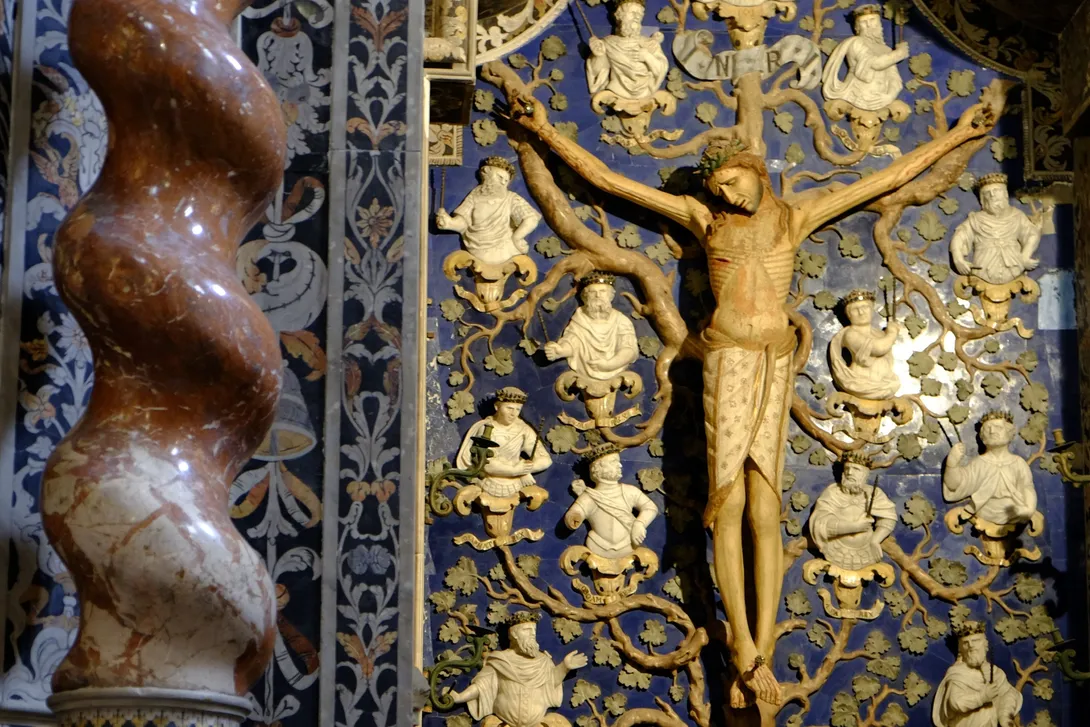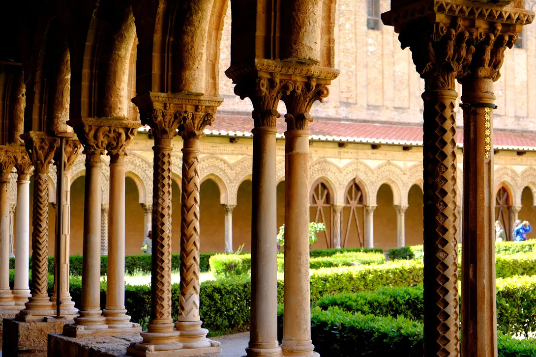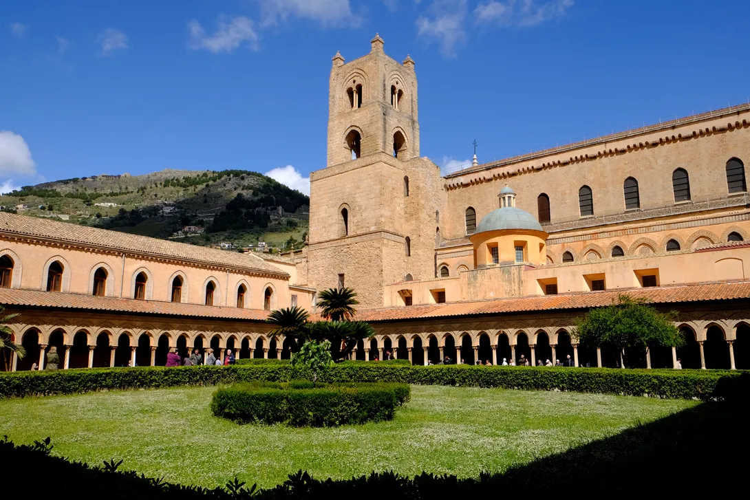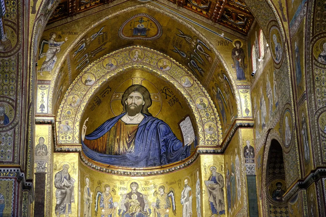 Dekoracje mozaikowe katedry w Monreale na Sycylii zostały wykonane na przełomie XII i XIII wieku przez mistrzów szkoły bizantyjskiej i weneckiej. Przedstawiają sceny ze Starego i Nowego Testamentu. W środkowej apsydzie u góry umieszczona jest gigantyczna postać Chrystusa Pantokratora o szerokości 13,3 m i wysokości 7 m. Chrystus unosi prawą rękę w geście błogosławieństwa, a w lewej trzyma otwartą księgę z łacińskim cytatem z Ewangelii wg św.Jana: "Ja jestem światłością świata, kto idzie za mną, nie będzie błądził w ciemności" [J 8, 12].