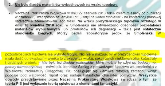 pozostałościach [po szczątkach] tupolewa nie wykryto [śladów] trotylu. Nic nie wskazuje [NA TO], by w prezydenckim tupolewie miało dojść do eksplozji – wynika to z ekspertyzy wraku, sekcji zwłok niektórych ofiar katastrofy i badanych próbek.”