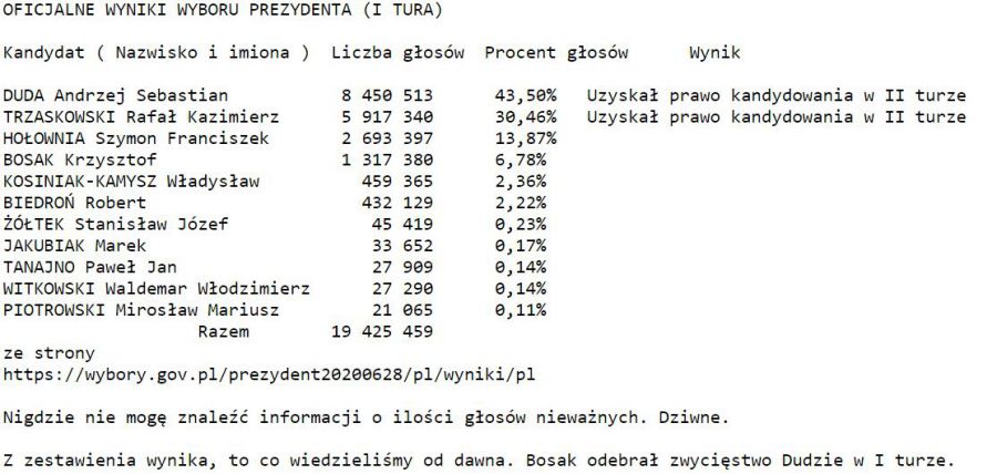 Oficjalne wyniki wyboru prezydenta 2020 I tura