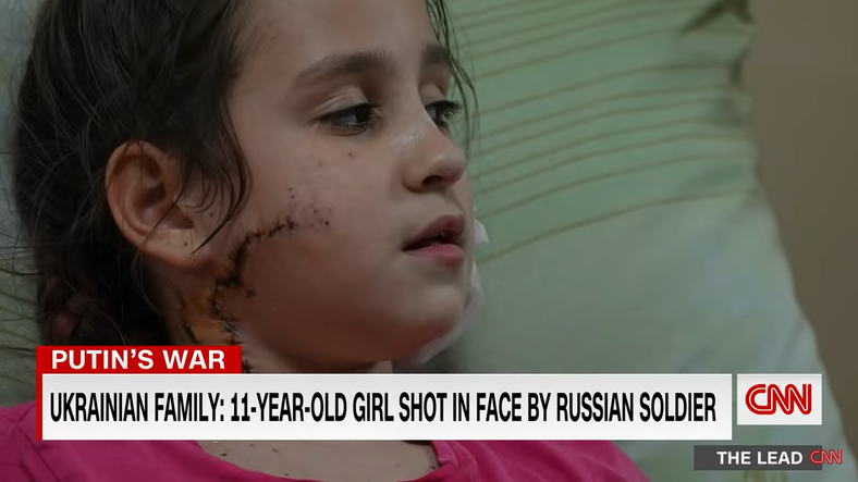 Nieco wcześniej sowiecki żołdak z Czeczeni  wystrzelił w twarz 11-letniej dziewczynce podczas ewakuacji z Mariupola nad Morzem Azowskim.Do dziewczynki strzelono bez uprzedzenia na punkcie kontrolnym koło Wasylówki, gdy razem z mamą, siostrą i babcią jechały z Mariupola.
