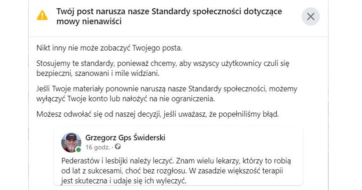 Chcia­łem jesz­cze do­pi­sać: „Na przy­kład do­ty­czy to gry­py”, ale zre­zy­gno­wa­łem. Uzna­łem, że war­to spraw­dzić jak na to za­re­agu­je sztucz­na in­te­li­gen­cja Zuc­ker­ber­ga. No i je­go al­go­rytm mnie zba­no­wał, oskar­ża­jąc, że to, co na­pi­sa­łem, to je­st mo­wa nie­na­wi­ści, któ­ra na­ru­sza je­go stan­dar­dy spo­łecz­no­ści.