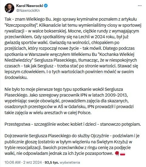 Karol Nawrocki wiele razy już tłumaczył, w jakich okolicznościach poznał Sergiusza Piaseckiego, ale przecież tusk uważa lektorat platformy za tak tępy, że dalej insynuuje, ze skoro Karol Nawrocki zna Wielkiego Bu tzn, ze jest powiązany ze światem przestępczym.