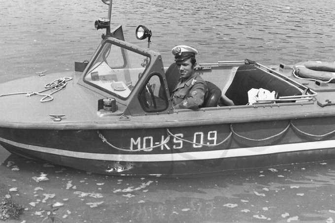 Archiwalna, niekoloryzowana fotografia środka transportu oczekującego na Lecha Wałęsę, który ma udać się do Stoczni na strajk