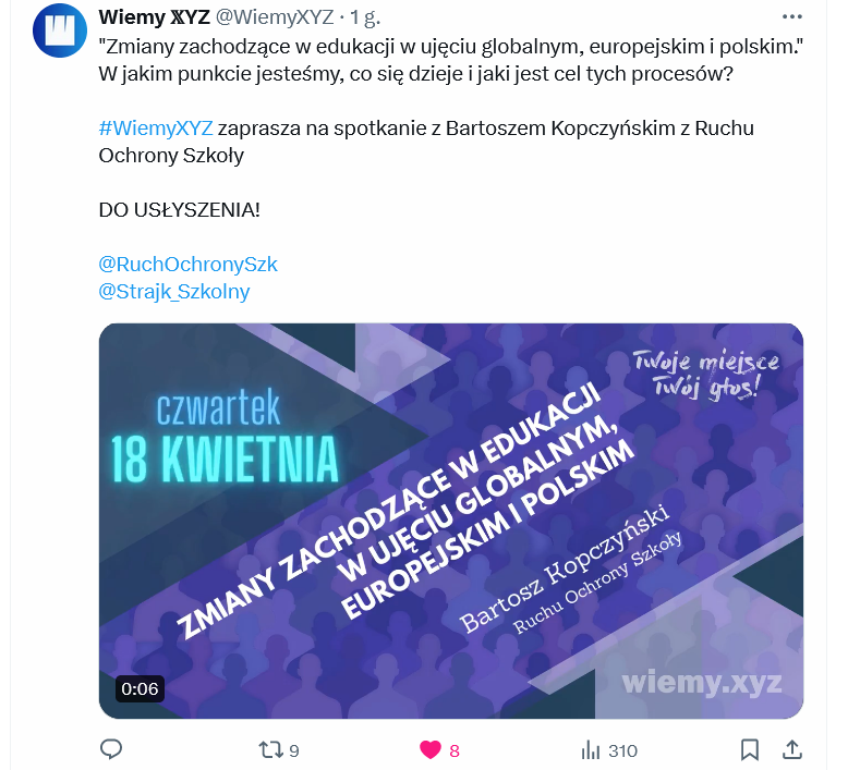 Już w najbliższy czwartek o 20:30 na profilu @WiemyXYZ spotkanie z Bartoszem Kopczyńskim z Ruchu Ochrony Szkoły.
